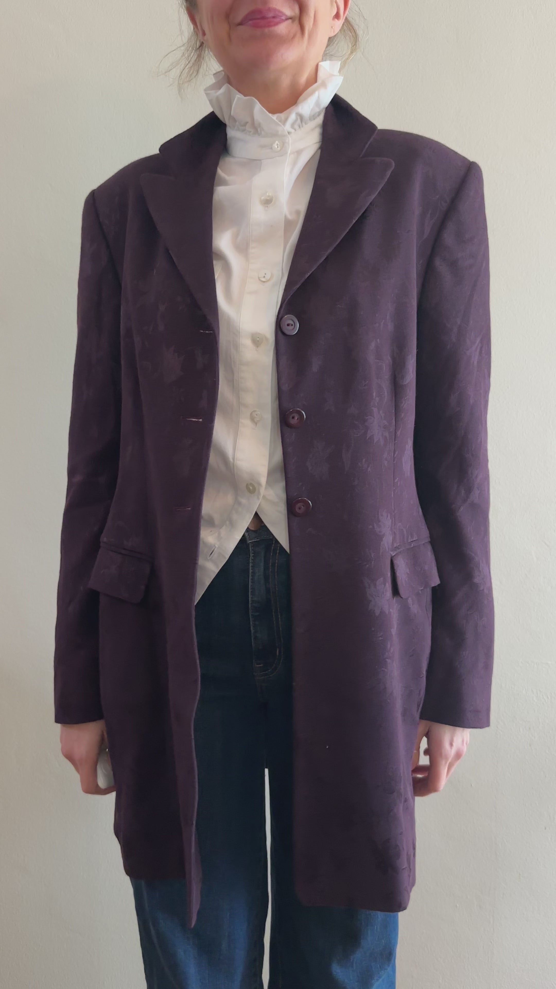 A tailored eggplant purple coat with a subtle tonal jacquard floral pattern throughout, giving it depth without feeling busy. Cleanly cut with a structured shoulder, classic lapel, and a straight, slightly fitted silhouette that layers easily over knits or blouses. Feels very late-90s to early-2000s in spirit—polished, feminine, and quietly statement-making.